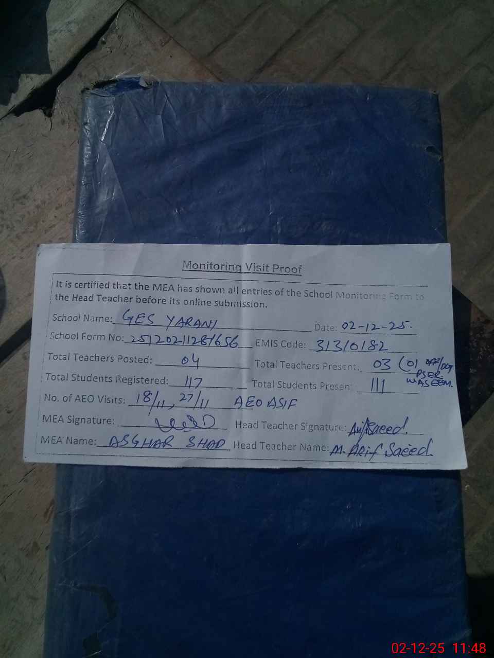 | Attendance Register | Head Teacher | MEA with School | Visit Proof |