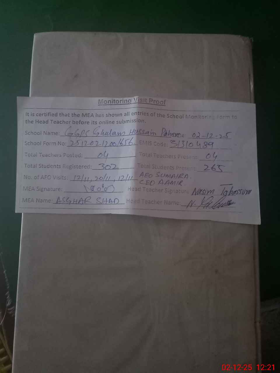 | EMIS Code: 31310489 | Name of School: GGPS BASTI JAM GHULAM HASSAN PAHOR (After Noon) | |||