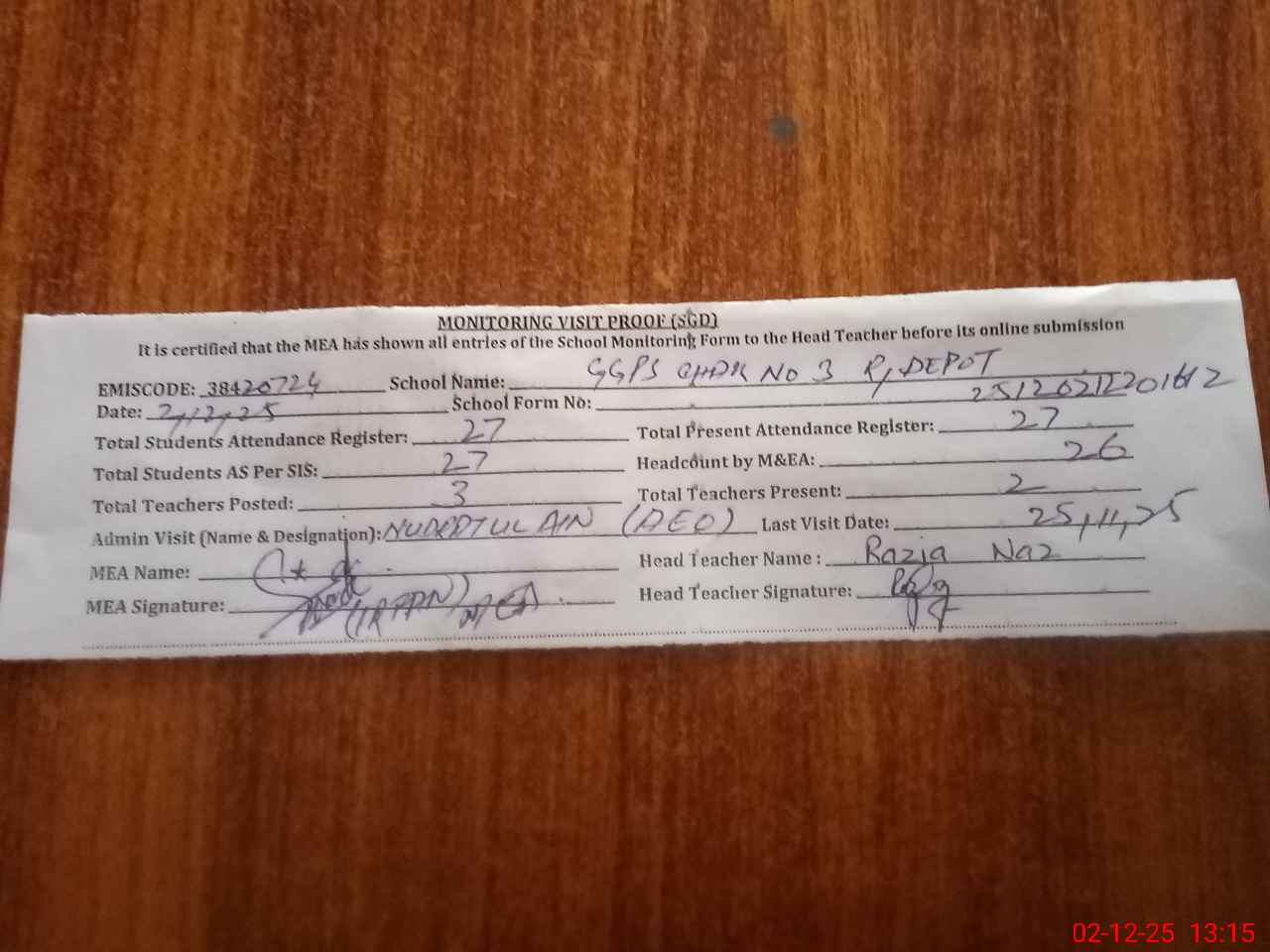 | EMIS Code: 38420724 | Name of School: GGPS CHAK NO.3 REMOUNT DEPOT | |||