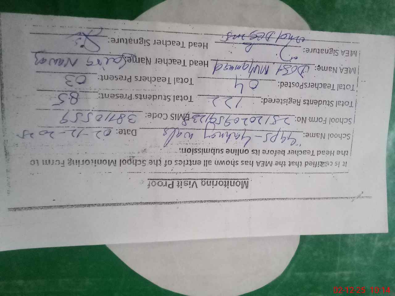 | Attendance Register | Head Teacher | MEA with School | Visit Proof |