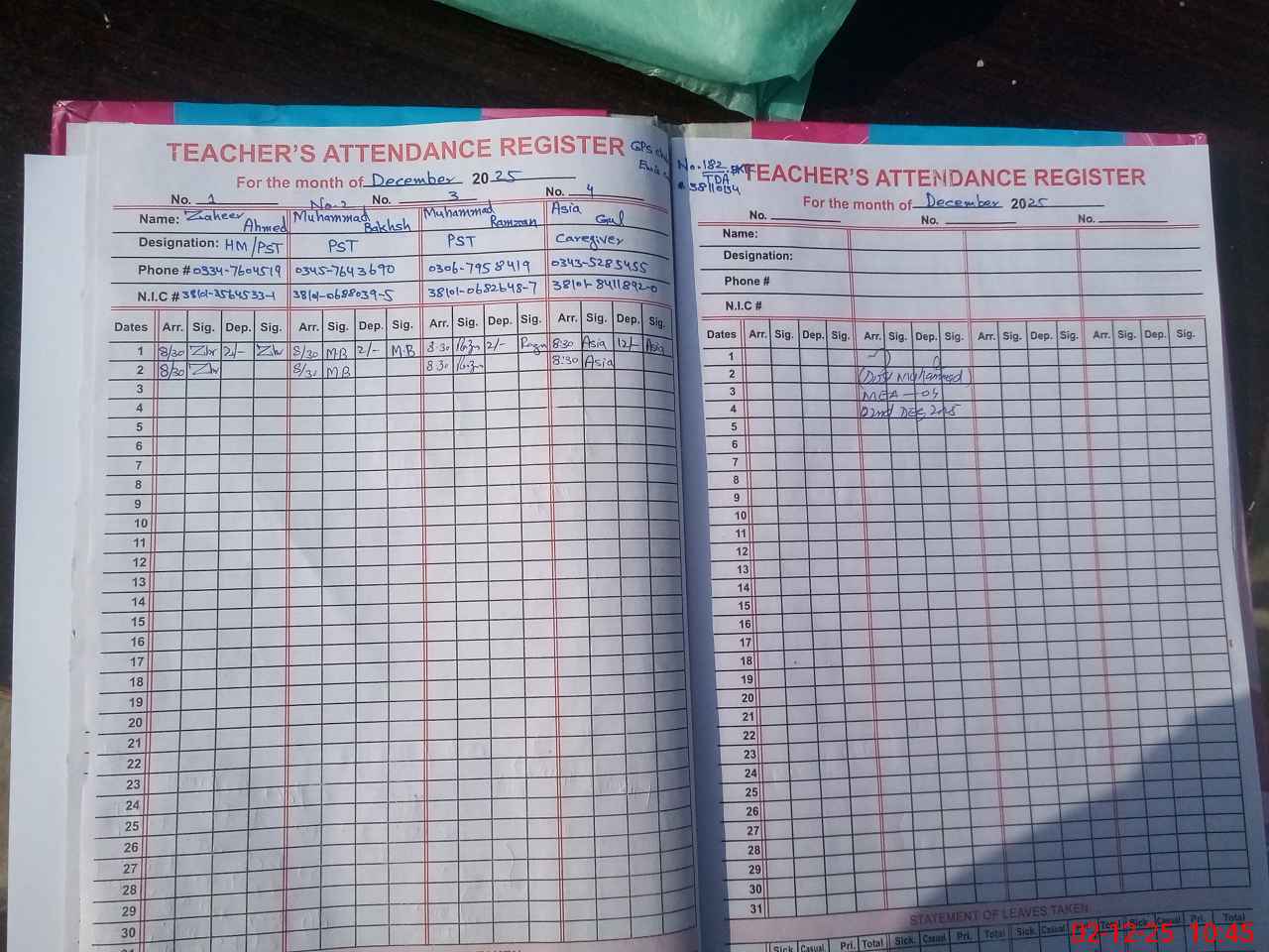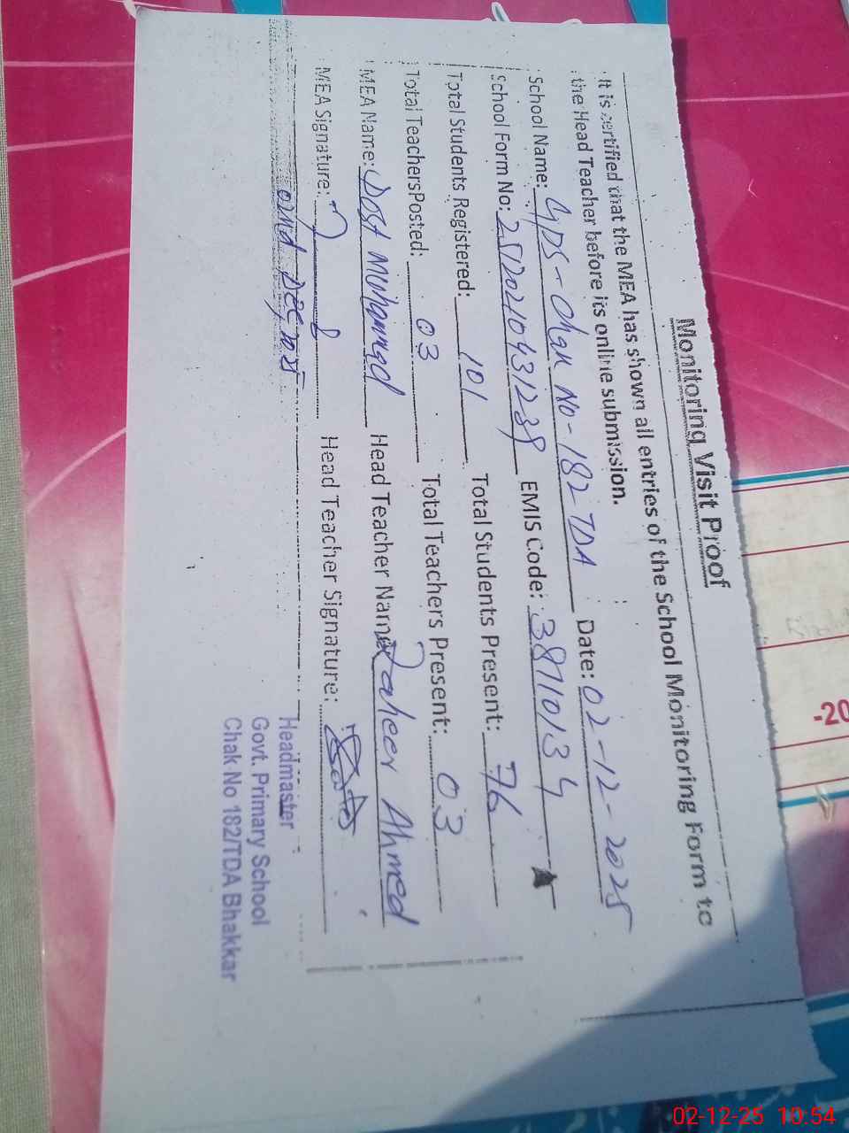 | Remarks (Use Separate Page if Required): All the entered data loudly share with the head teacher before submitting Last visited the subject school by Educational Authority Ulfat Hussain AEO 27th November 2025 | |||||