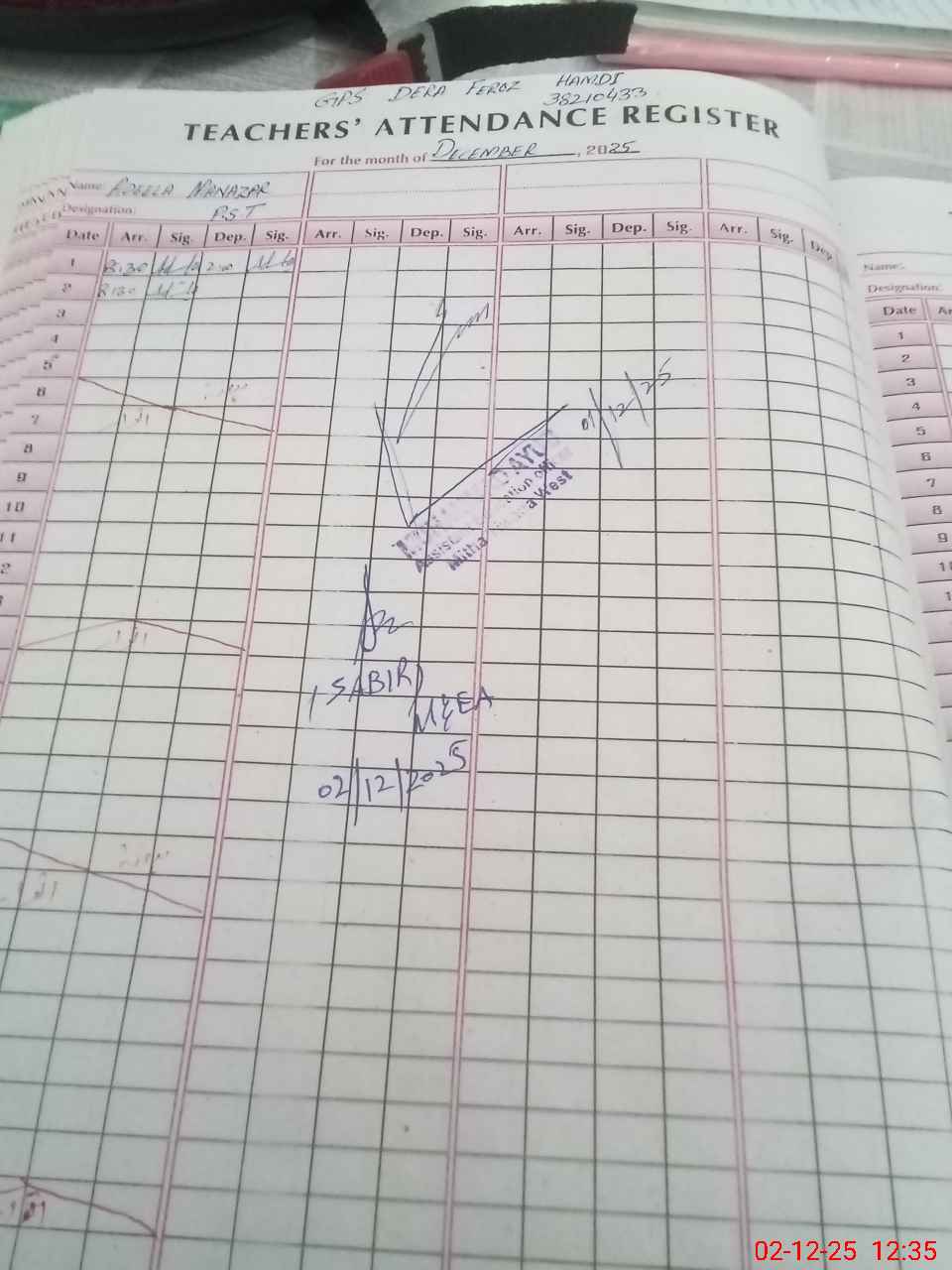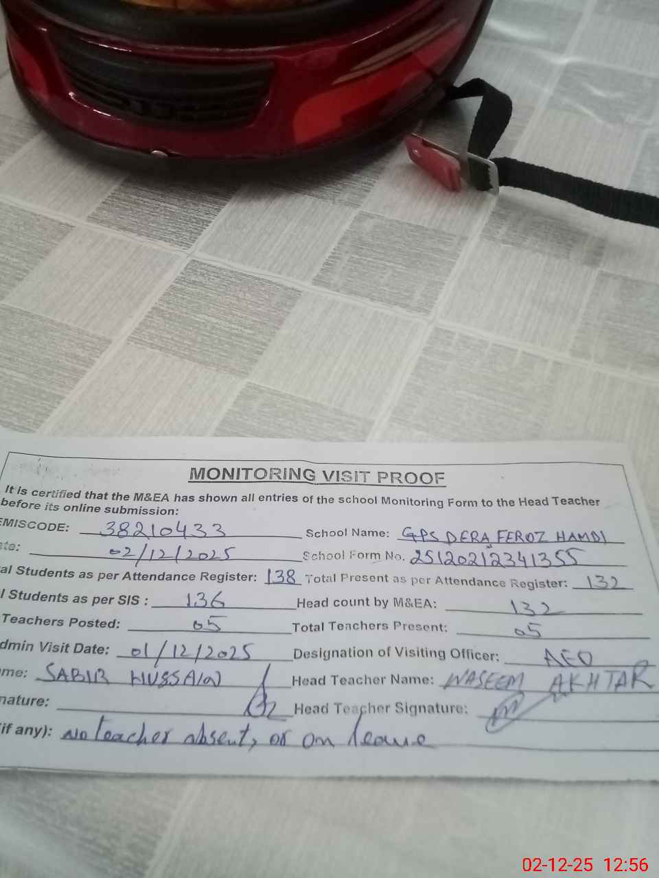 | Remarks (Use Separate Page if Required): no teacher absent total students 138 present students 132 last admin visit by AEO on 01 Dec 2025 | |||||