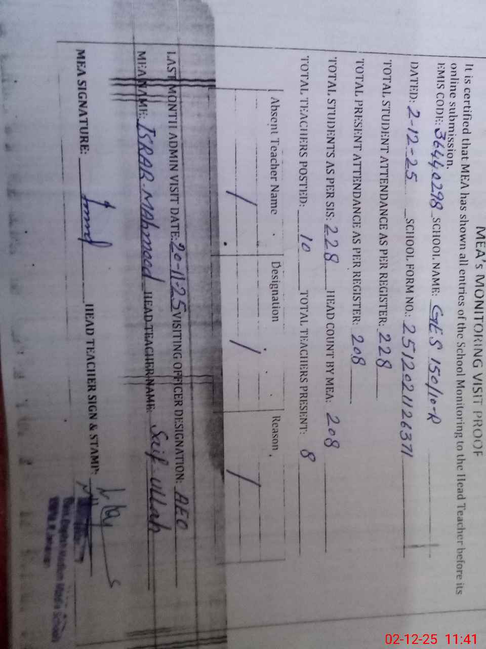 | Attendance Register | Head Teacher | MEA with School | Visit Proof |