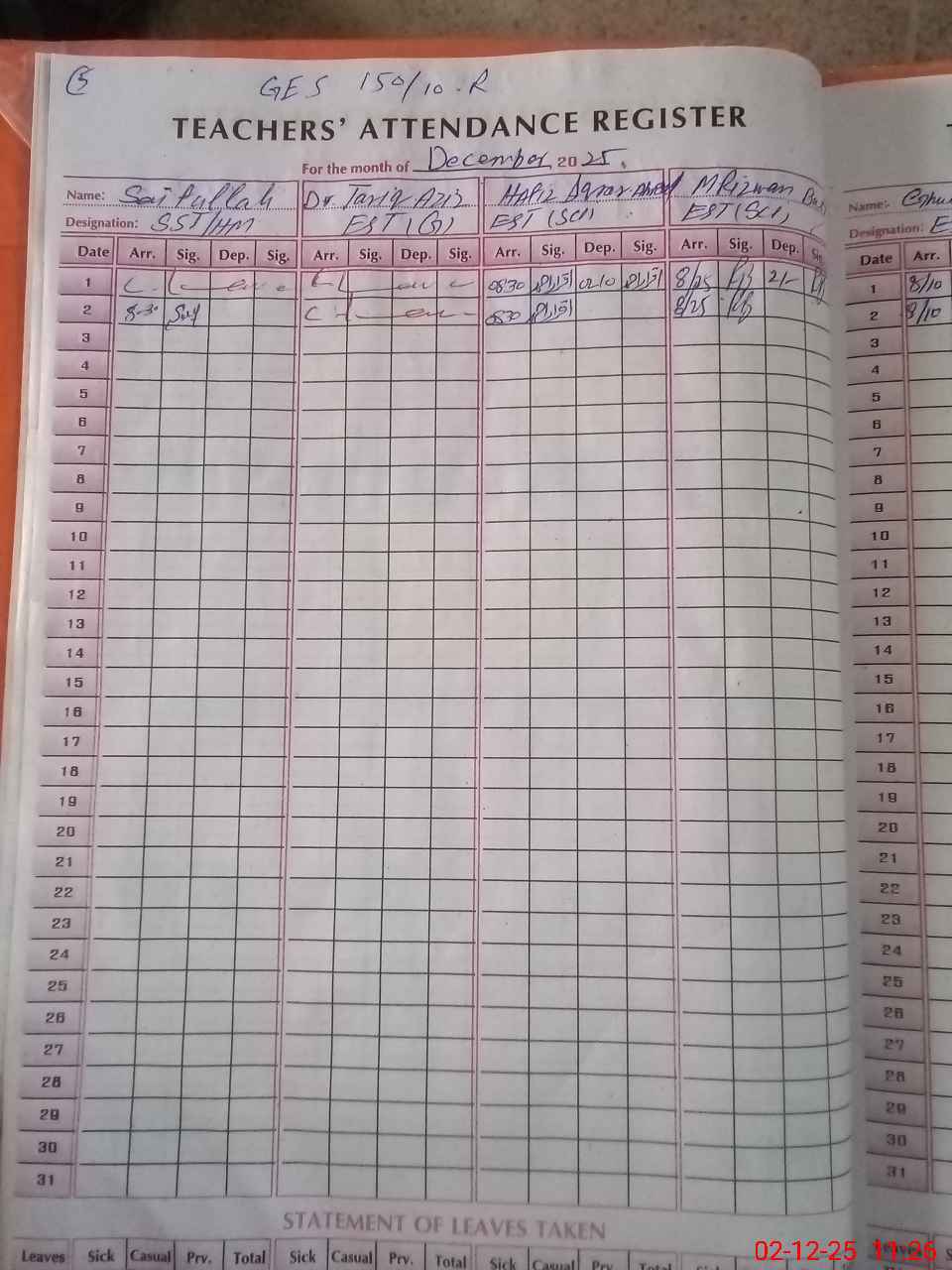 | CNIC | Full Name | Designation | R/C | Absence During Last Calender Month |
