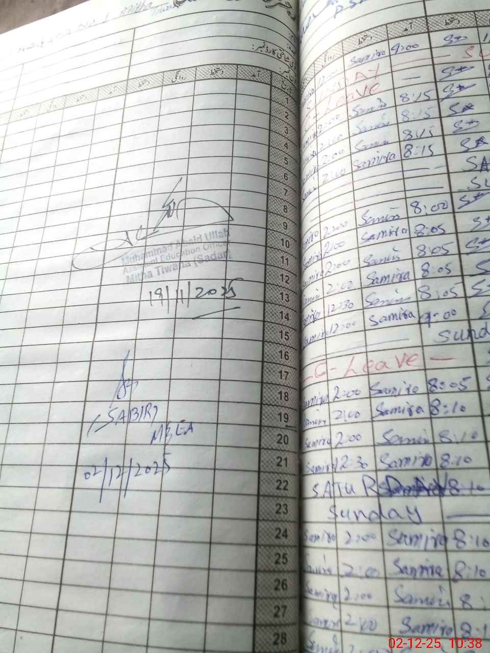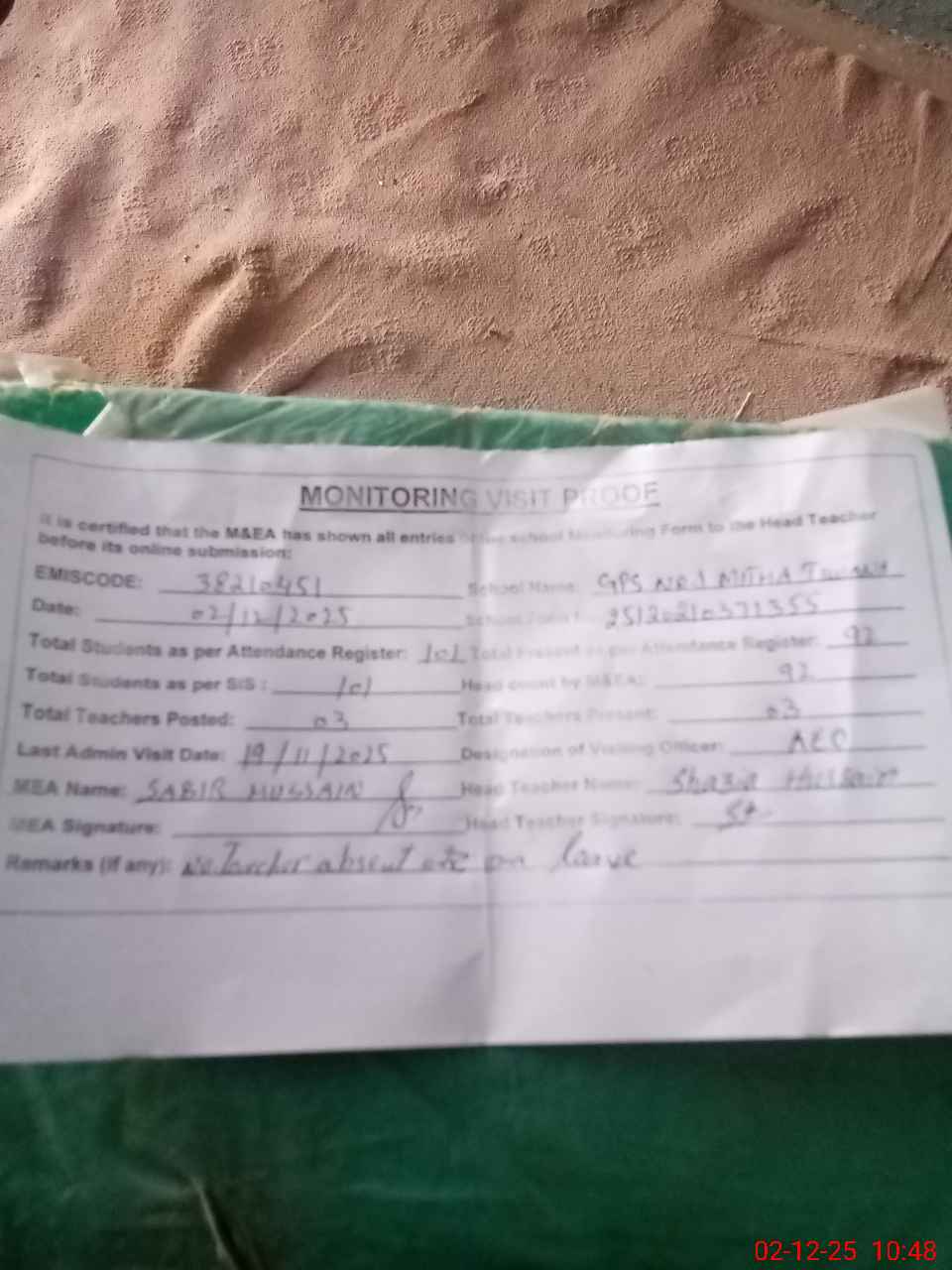 | Remarks (Use Separate Page if Required): no teacher absent total students 101 present students 92 last admin visit by AEO on 19 Nov 2025 | |||||