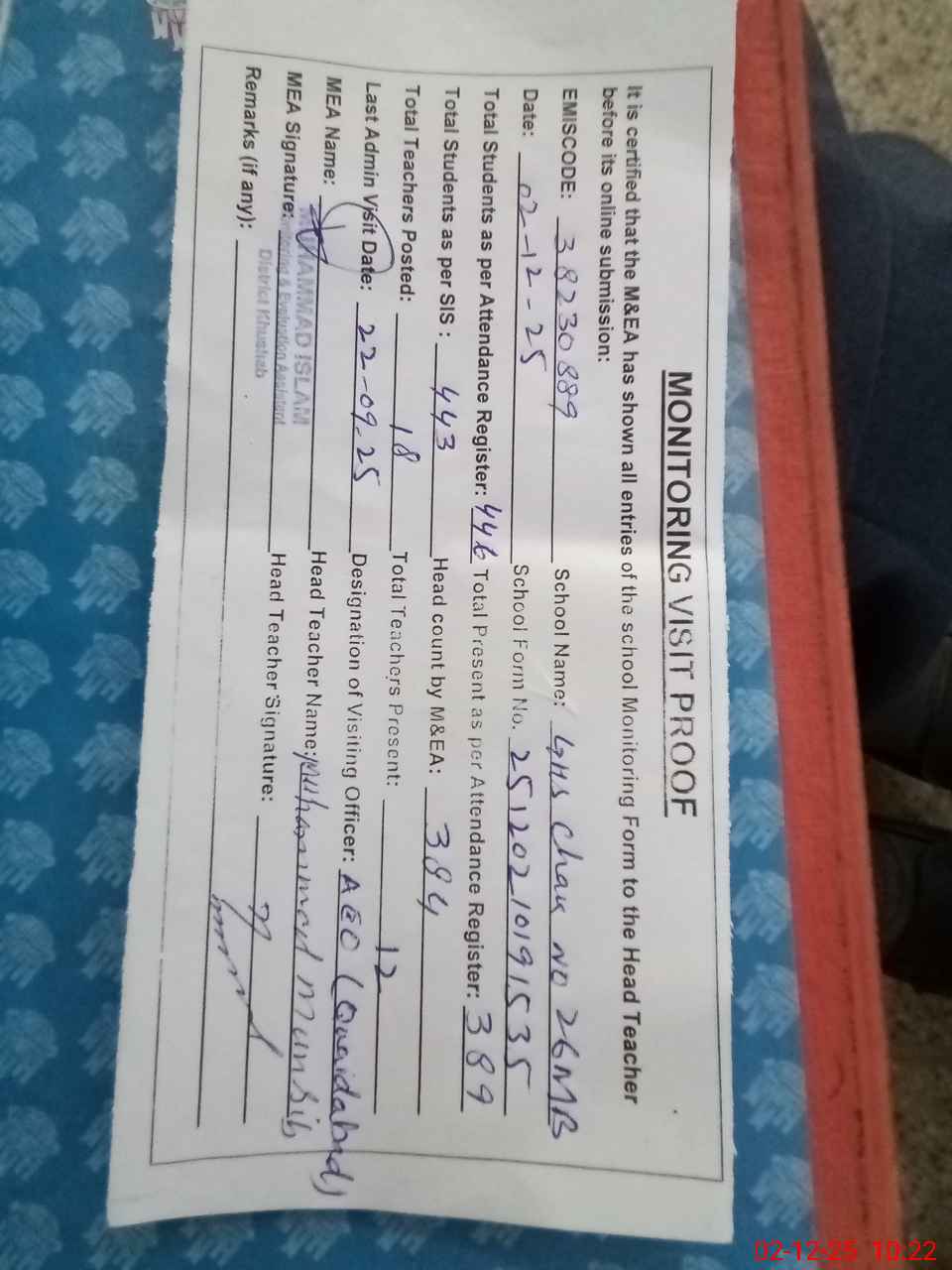 | EMIS Code: 38230889 | Name of School: GHS CHAK NO. 26/MB | |||