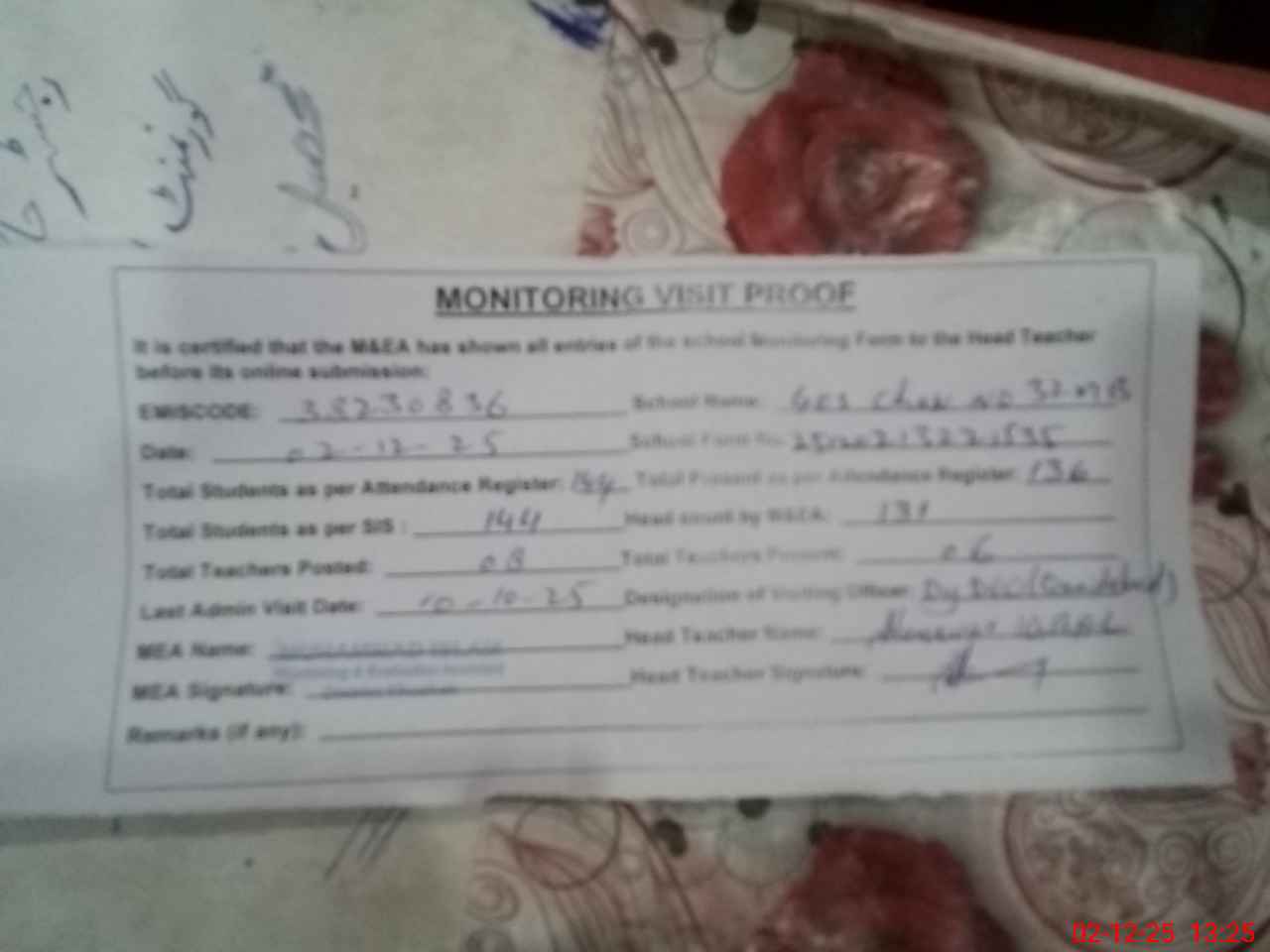 | Remarks (Use Separate Page if Required): Dy DEO visited school on 10 October 2025 Students strength on sis 119 | |||||