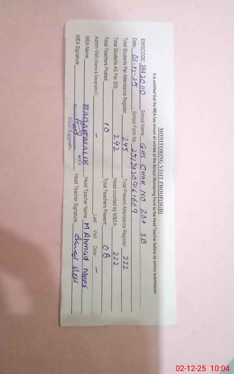 | EMIS Code: 38420110 | Name of School: GHS CHAK NO.23 ASB | |||