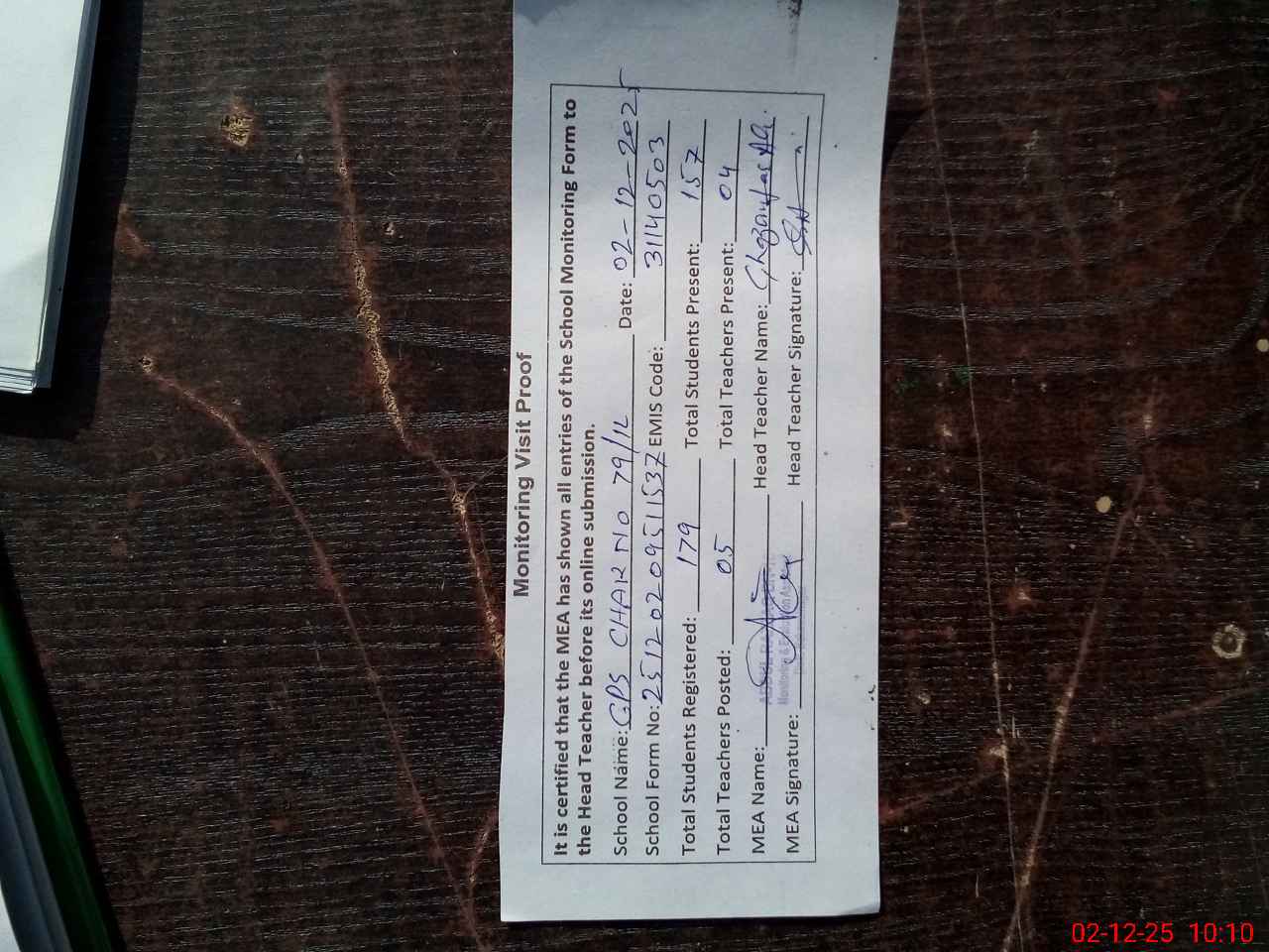 | Attendance Register | Head Teacher | MEA with School | Visit Proof |