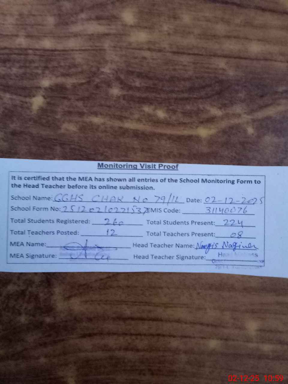 | Attendance Register | Head Teacher | MEA with School | Visit Proof |