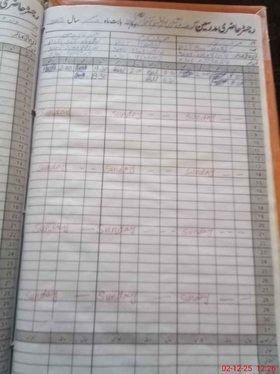 | CNIC | Full Name | Designation | R/C | Absence During Last Calender Month |