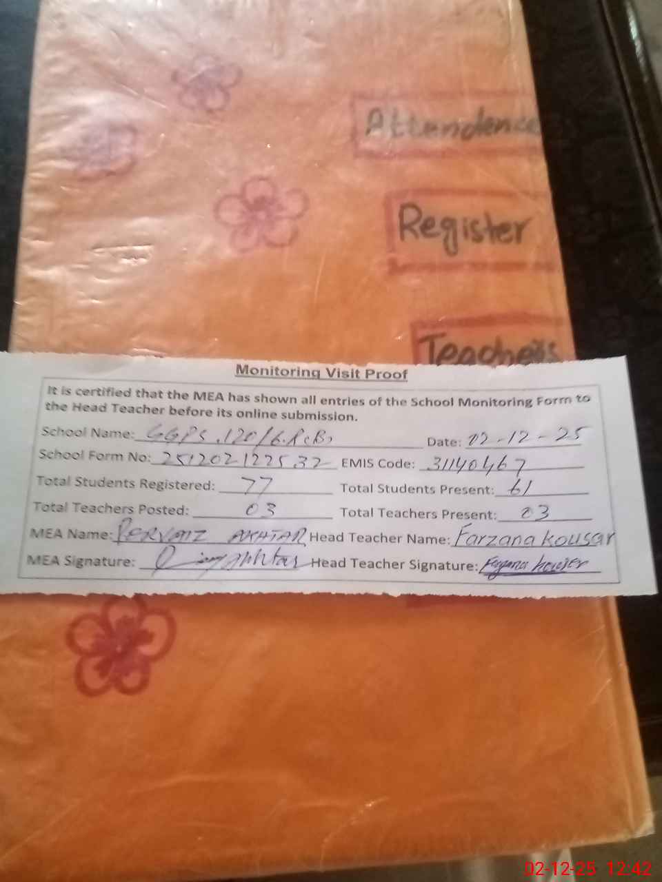 | Attendance Register | Head Teacher | MEA with School | Visit Proof |