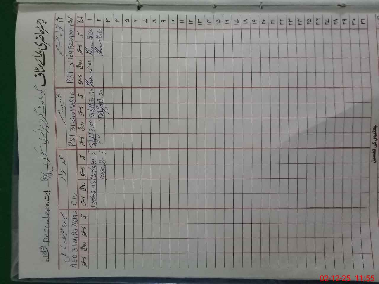 | CNIC | Full Name | Designation | R/C | Absence During Last Calender Month |
