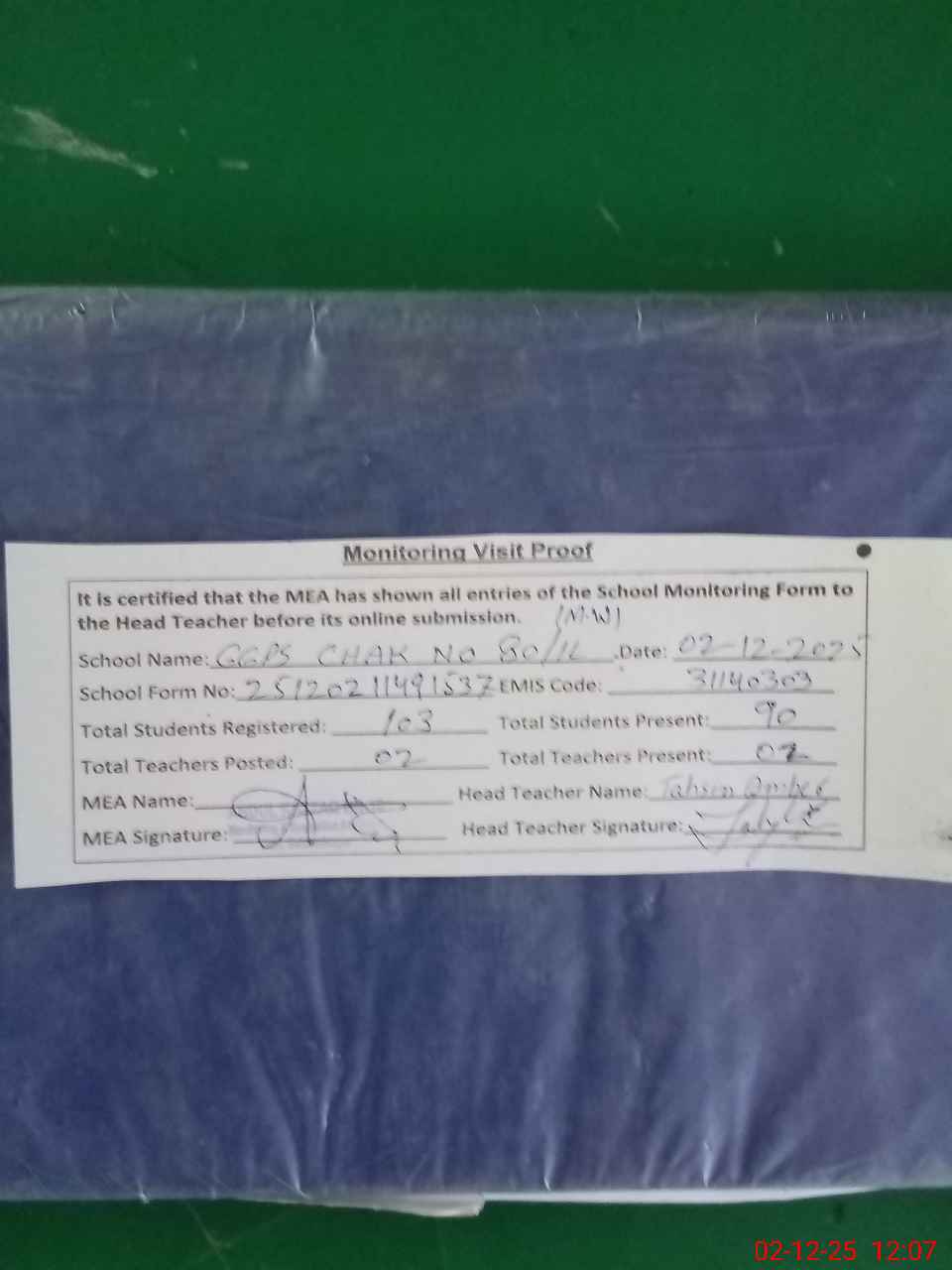 | Attendance Register | Head Teacher | MEA with School | Visit Proof |