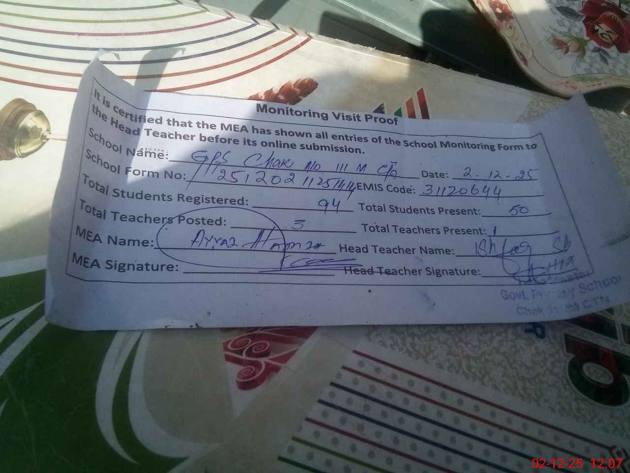 | EMIS Code: 31120644 | Name of School: GPS CHAK 111/M | |||