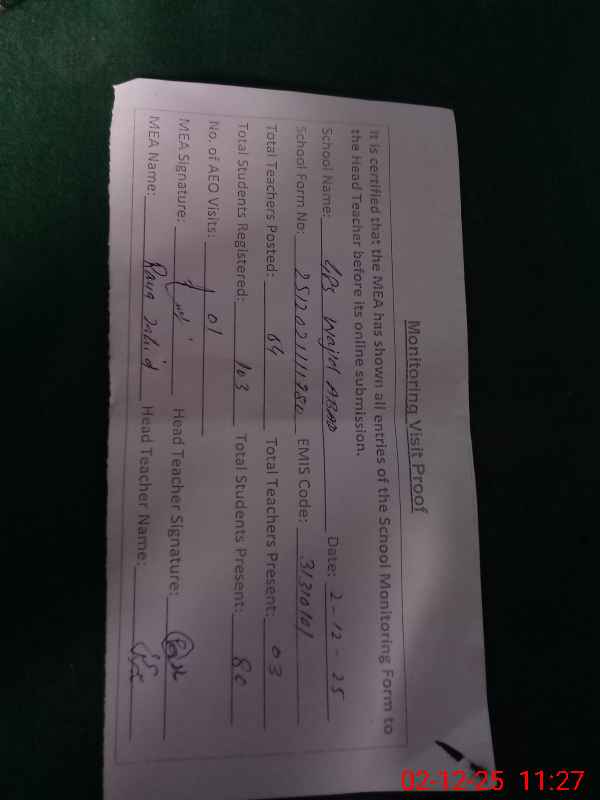 | Attendance Register | Head Teacher | MEA with School | Visit Proof |