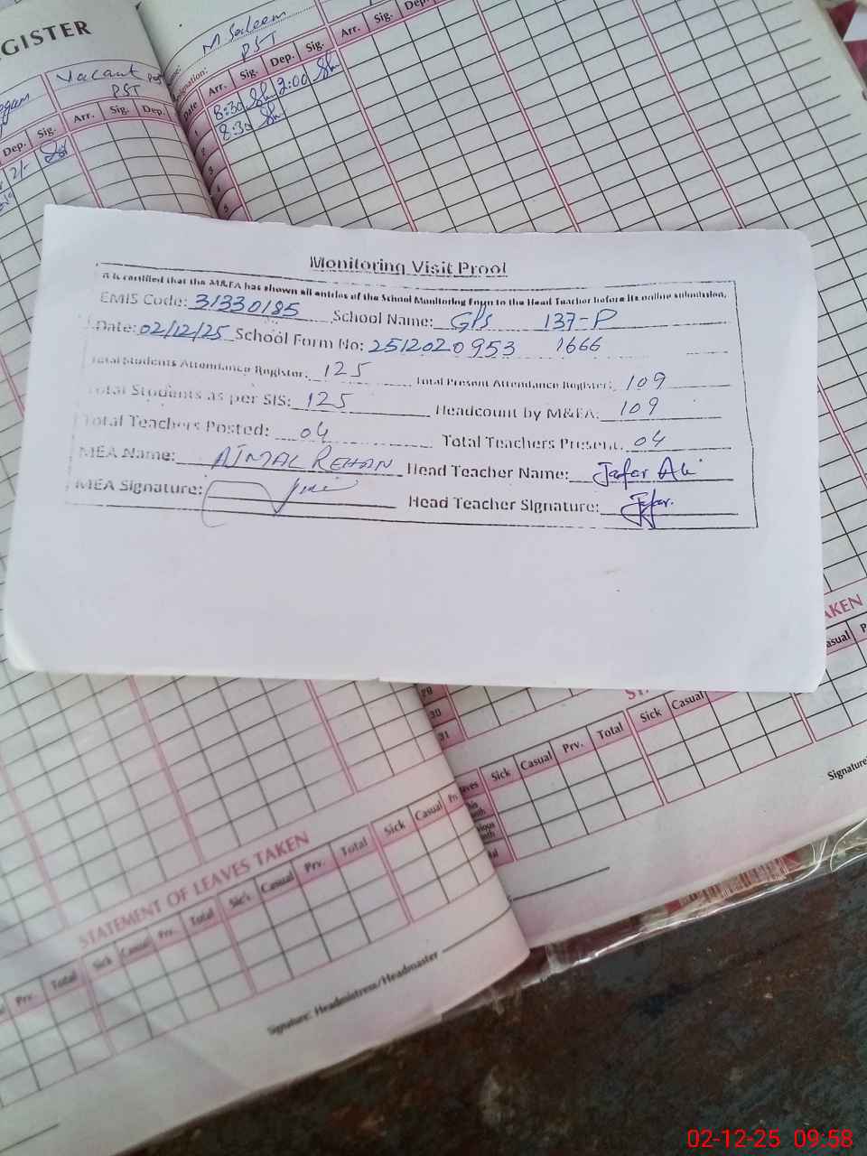 | Attendance Register | Head Teacher | MEA with School | Visit Proof |