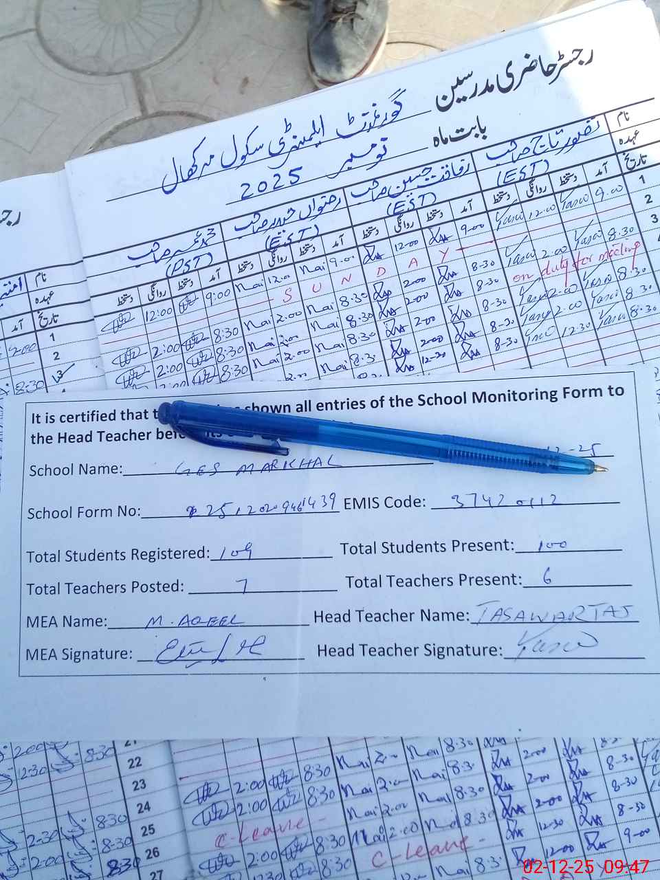 | Attendance Register | Head Teacher | MEA with School | Visit Proof |