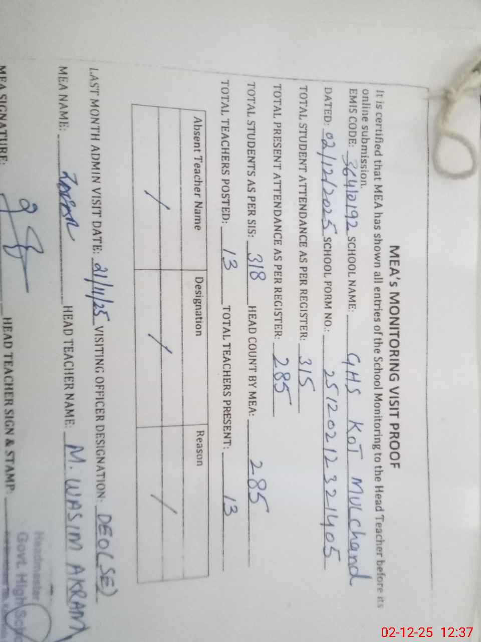 | Attendance Register | Head Teacher | MEA with School | Visit Proof |