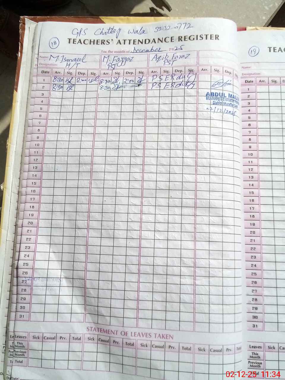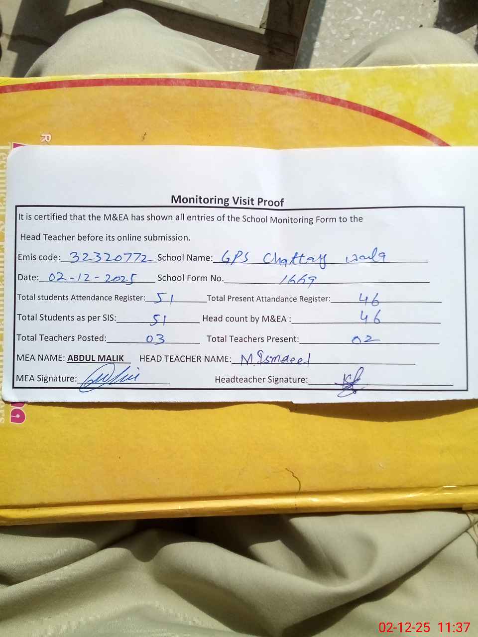 | EMIS Code: 32320772 | Name of School: GPS CHATTAY WALA | |||