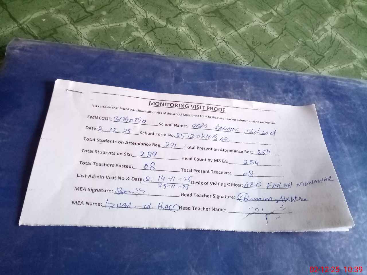 | Attendance Register | Head Teacher | MEA with School | Visit Proof |