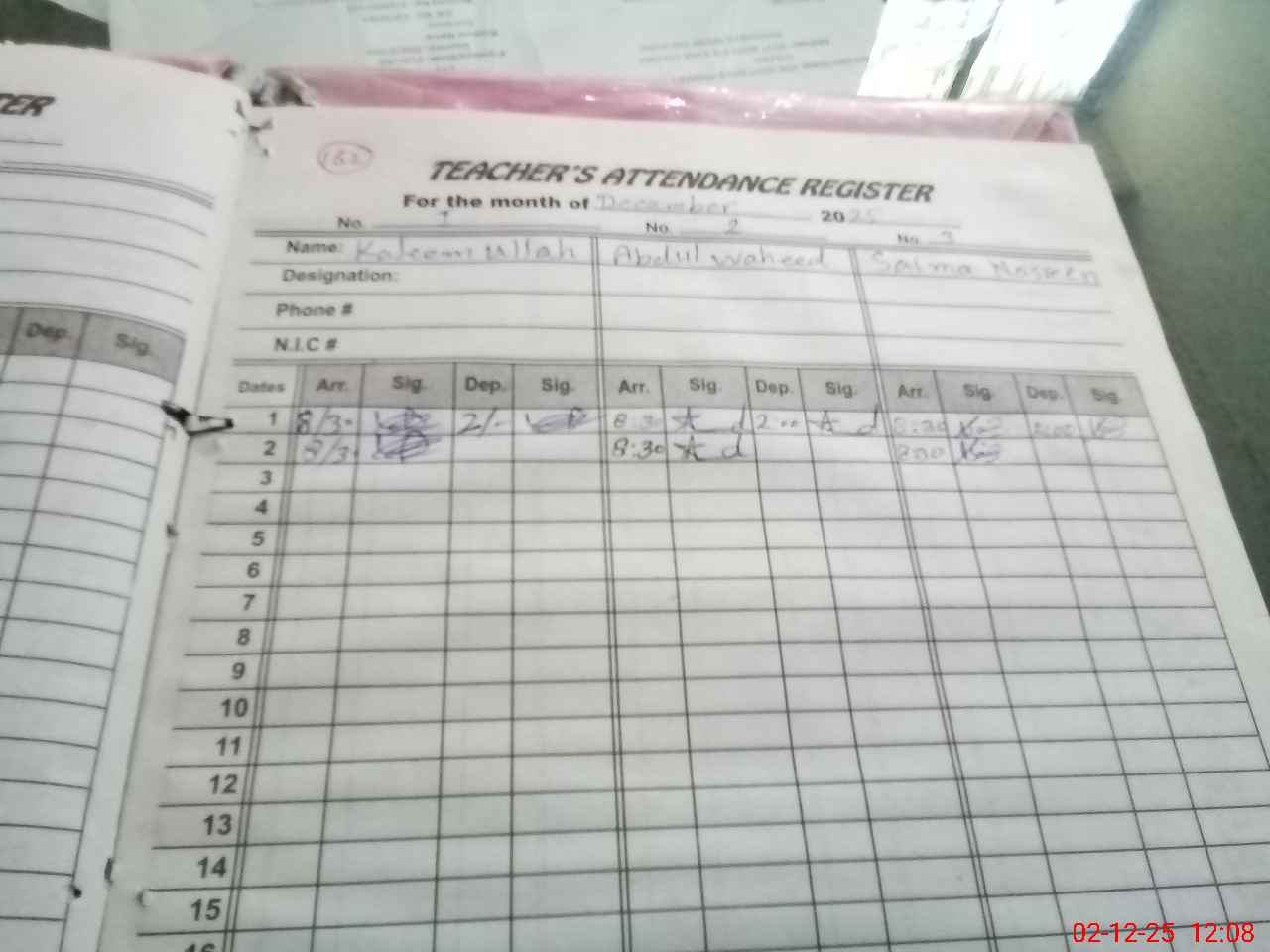 | CNIC | Full Name | Designation | R/C | Absence during last cal. month |