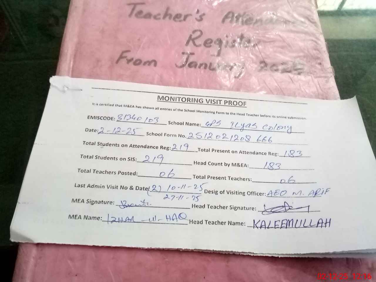 | Attendance Register | Head Teacher | MEA with School | Visit Proof |