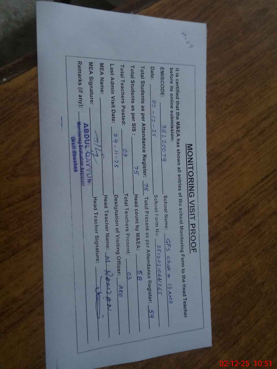 | Attendance Register | Head Teacher | MEA with School | Visit Proof |