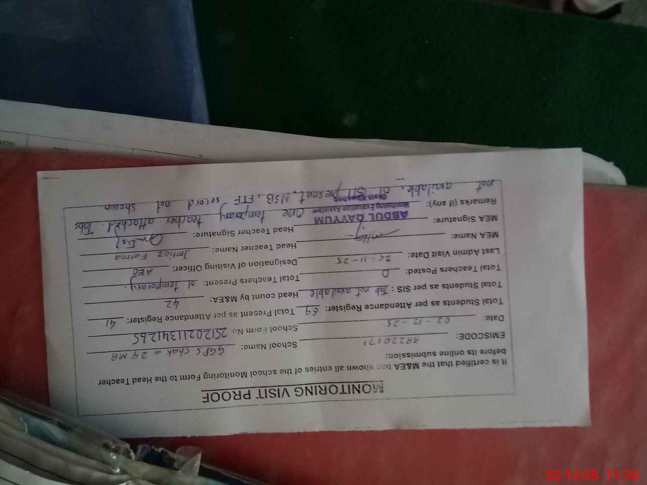 | Attendance Register | Head Teacher | MEA with School | Visit Proof |