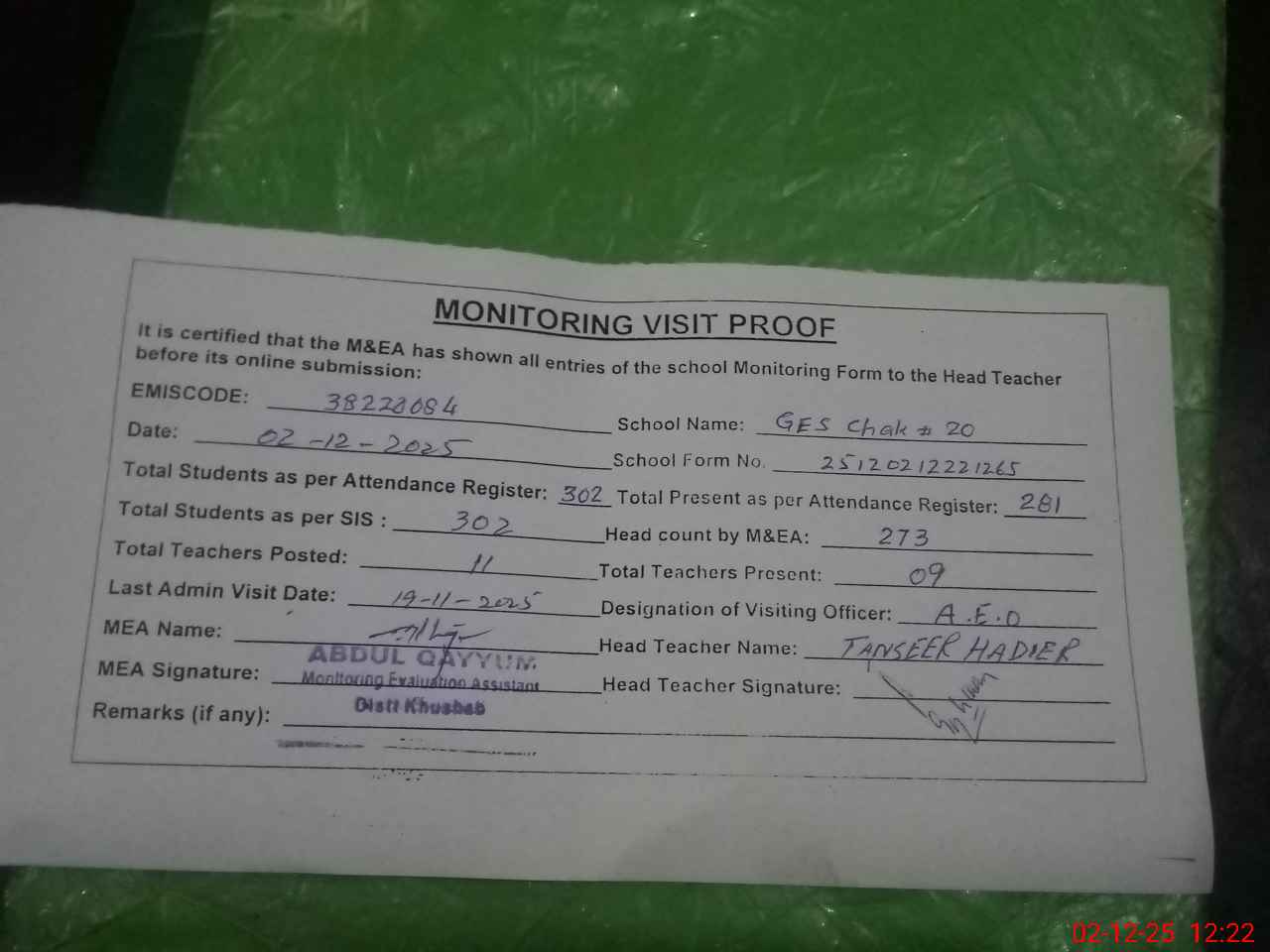 | EMIS Code: 38220084 | Name of School: GES CHAK NO. 20/MB | |||