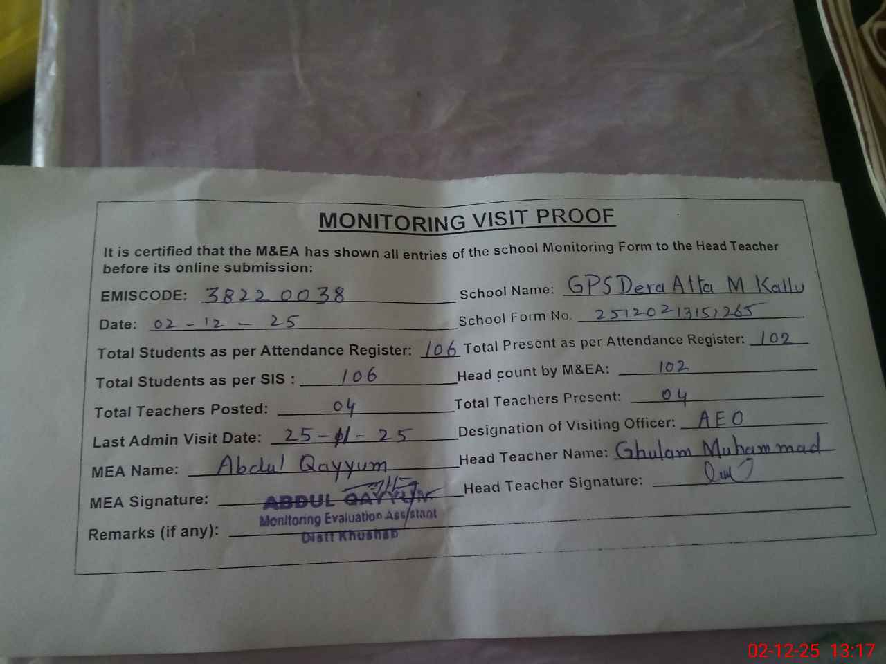 | Attendance Register | Head Teacher | MEA with School | Visit Proof |