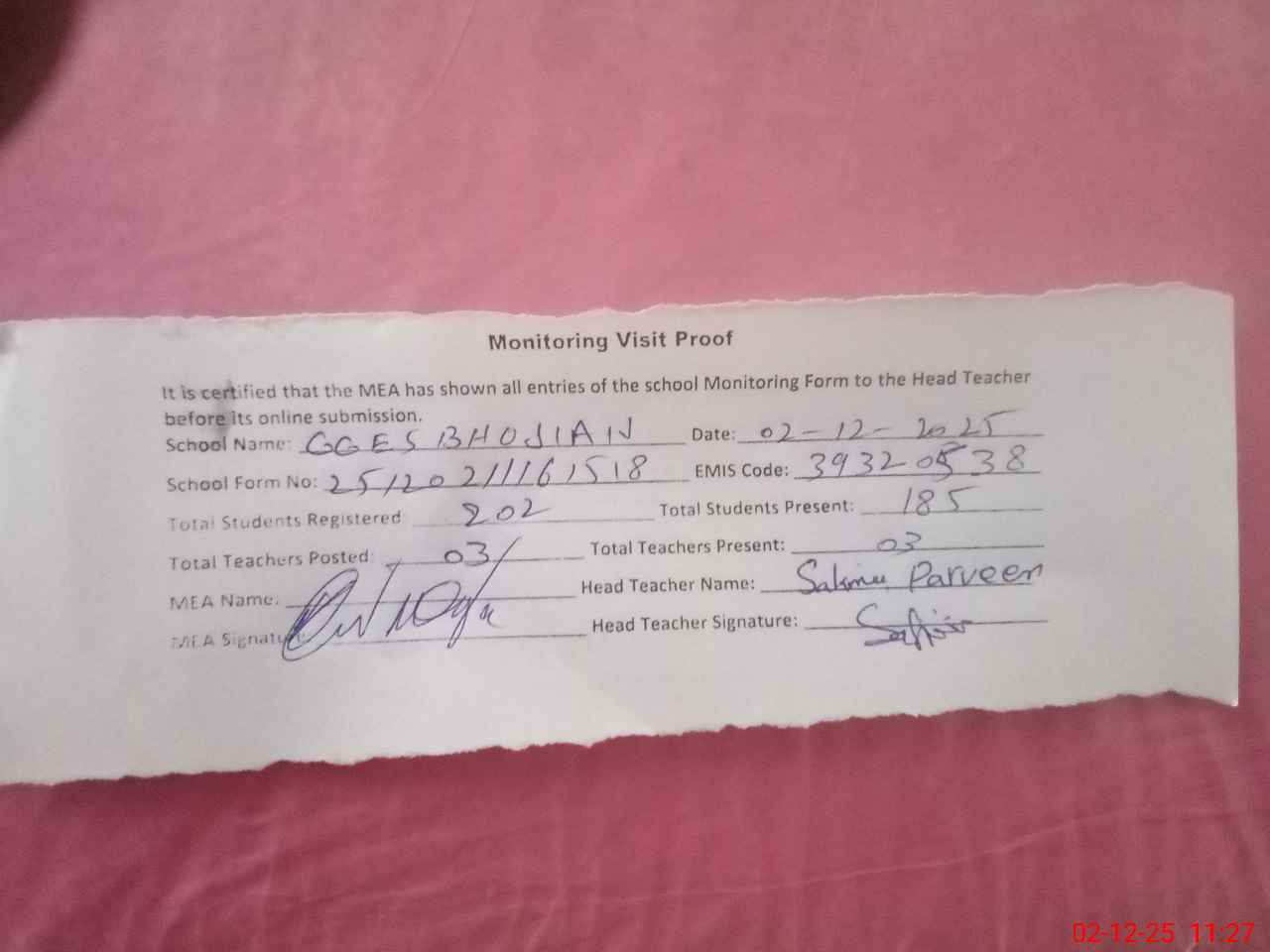 | Attendance Register | Head Teacher | MEA with School | Visit Proof |