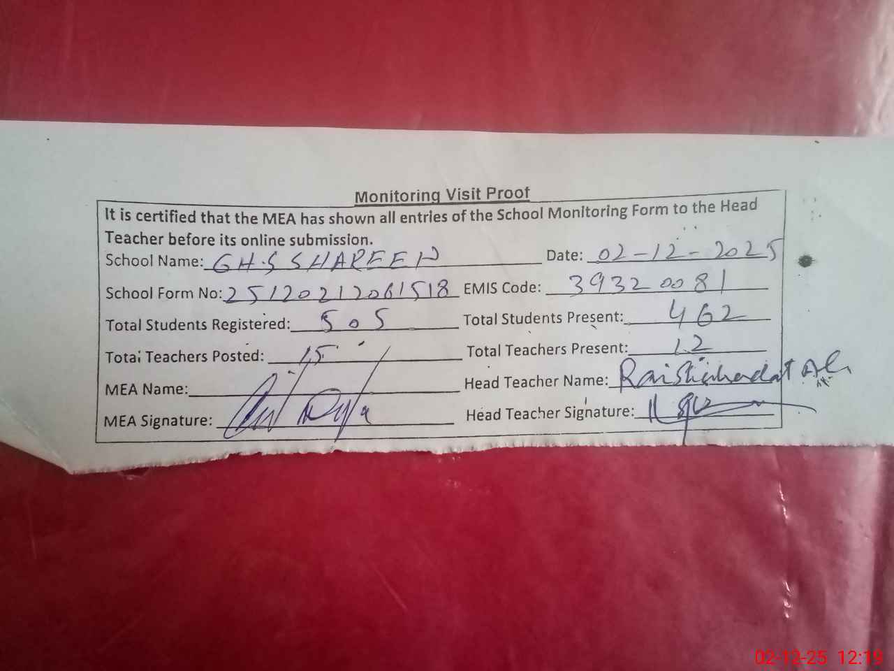 | Attendance Register | Head Teacher | MEA with School | Visit Proof |