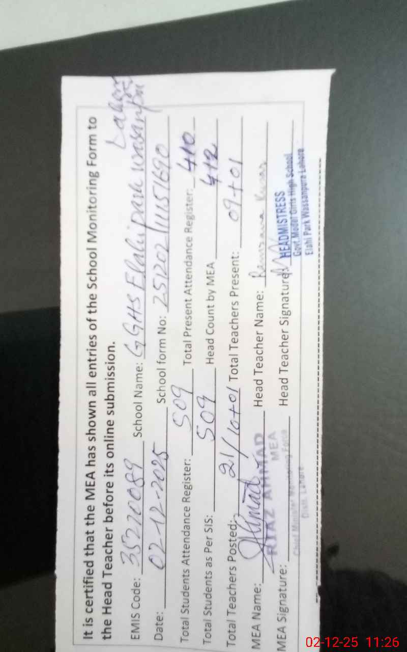 | EMIS Code: 35220089 | Name of School: GGHS MODEL ELAHI PARK WASSAN PURA LHR | |||