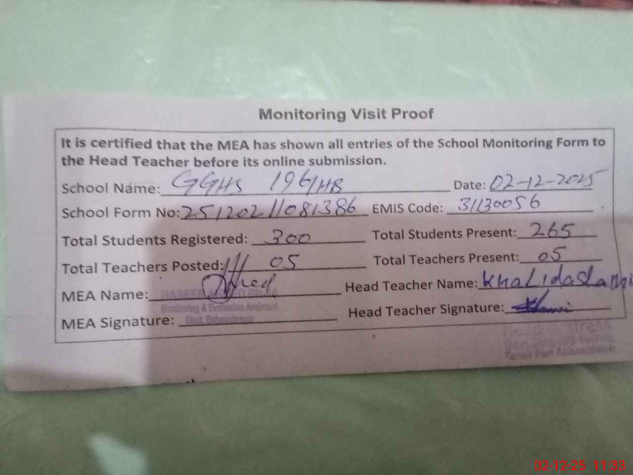 | EMIS Code: 31130056 | Name of School: GGHS CHAK NO 196 HB | |||