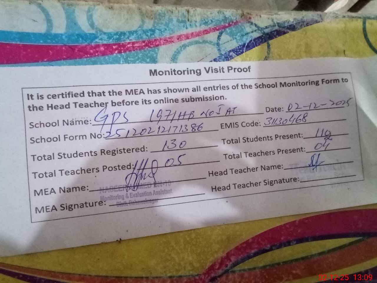 | Attendance Register | Head Teacher | MEA with School | Visit Proof |
