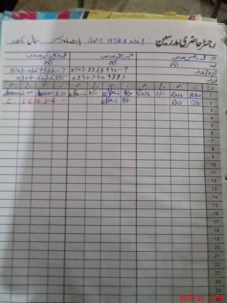 | CNIC | Full Name | Designation | R/C | Absence During Last Calender Month |