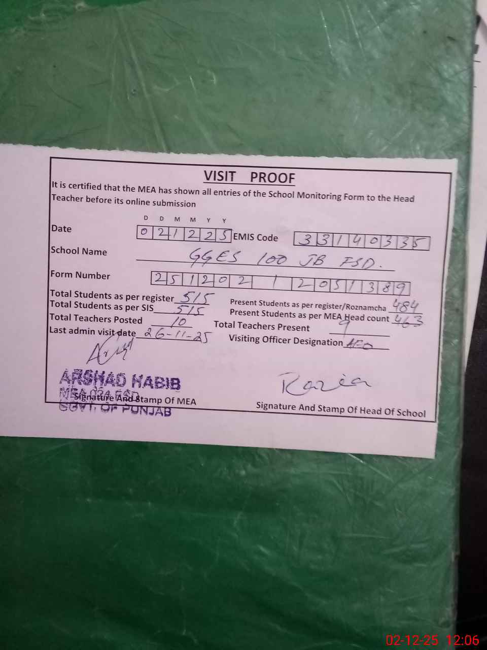 | Attendance Register | Head Teacher | MEA with School | Visit Proof |
