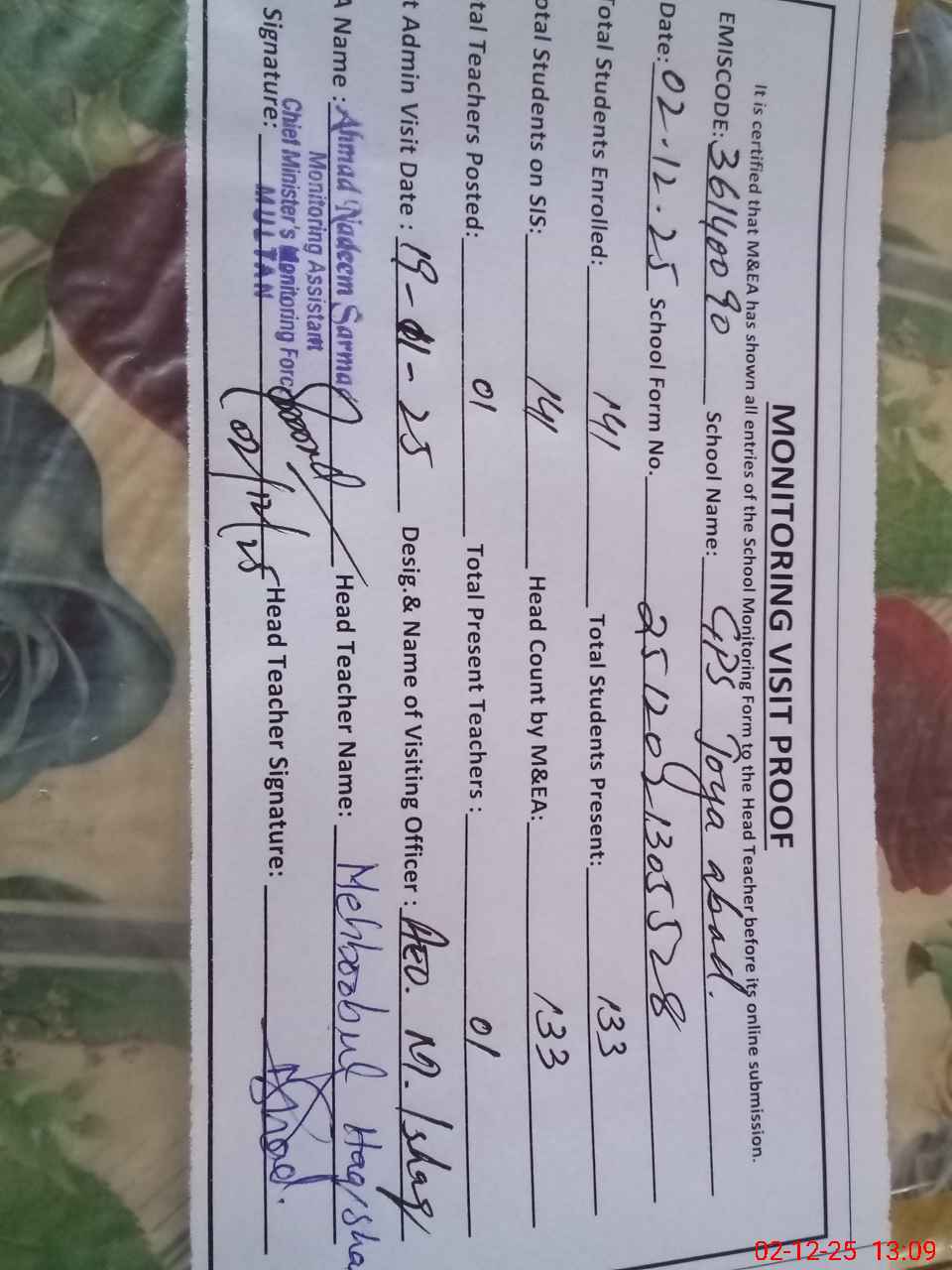 | EMIS Code: 36140090 | Name of School: GPS JOYYA ABAD P/O KOTLA CHAKAR | |||