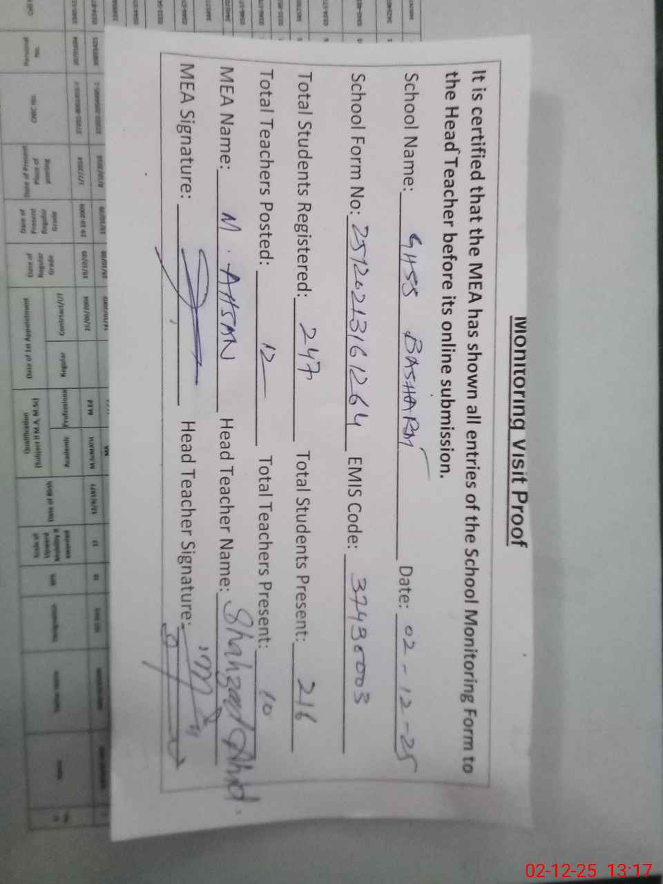 | Attendance Register | Head Teacher | MEA with School | Visit Proof |