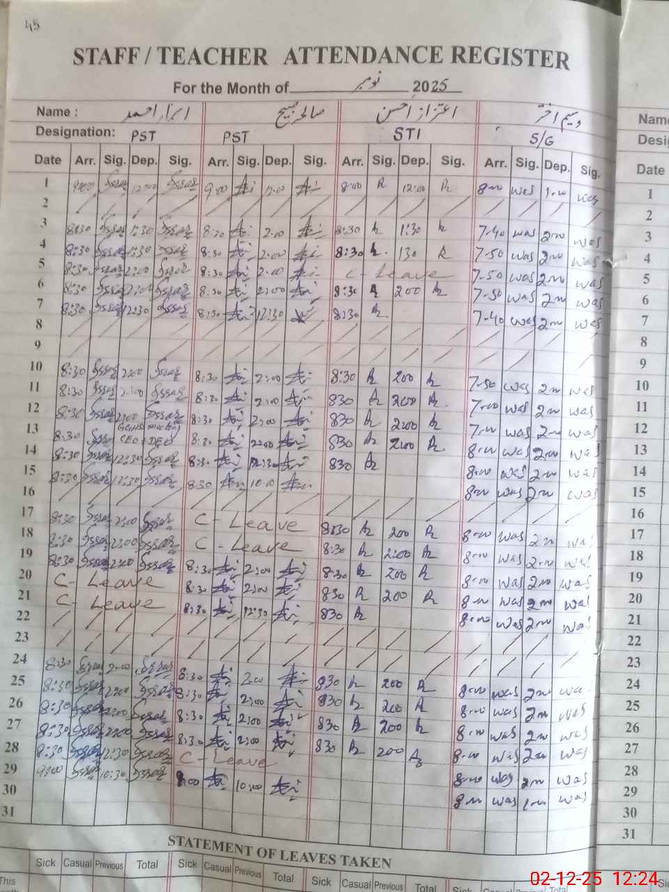 | CNIC | Full Name | Designation | R/C | Absence During Last Calender Month |