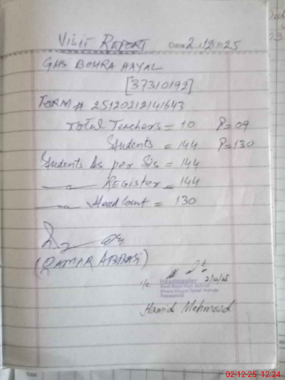| Attendance Register | Head Teacher | MEA with School | Visit Proof |