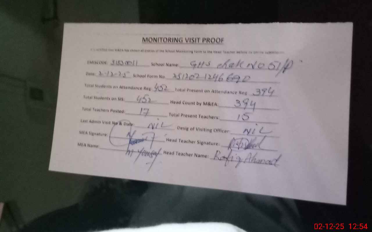 | Attendance Register | Head Teacher | MEA with School | Visit Proof |