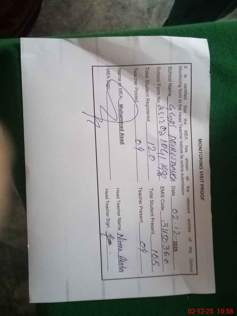 | Attendance Register | Head Teacher | MEA with School | Visit Proof |