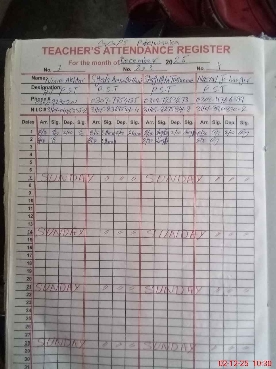 | CNIC | Full Name | Designation | R/C | Absence During Last Calender Month |