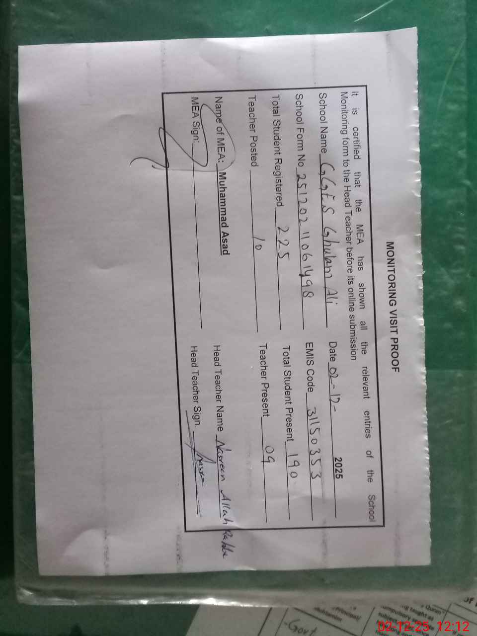 | Attendance Register | Head Teacher | MEA with School | Visit Proof |