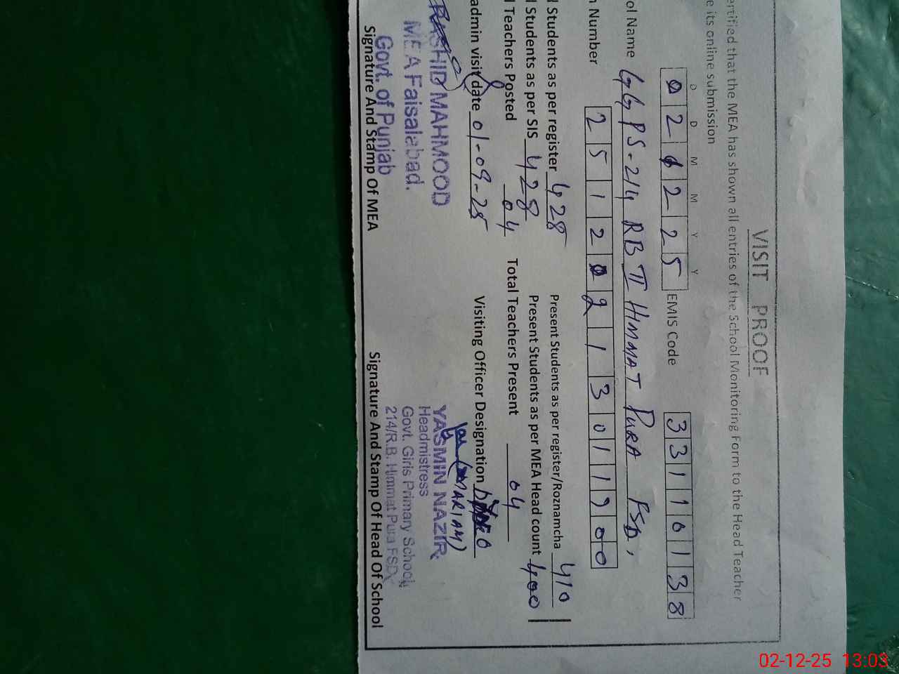 | EMIS Code: 33110138 | Name of School: GGPS CHAK NO 214 RB HIMMAT PURA | |||
