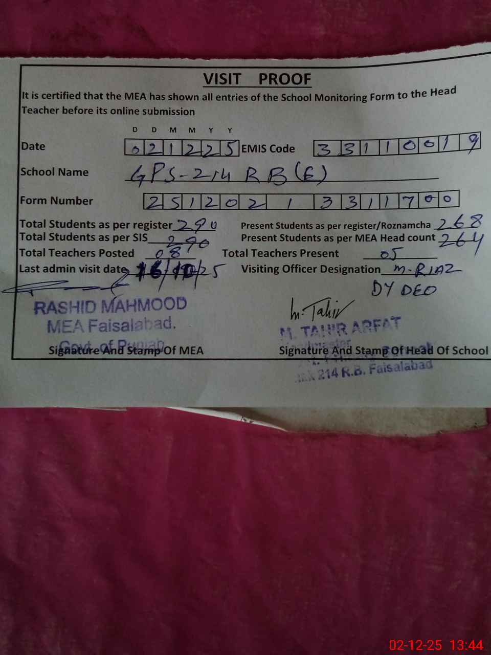 | Certified that this School was Inspected by the Undersigned MEA/DMO Today and the Information Stated Above is as Per Record. | |||||