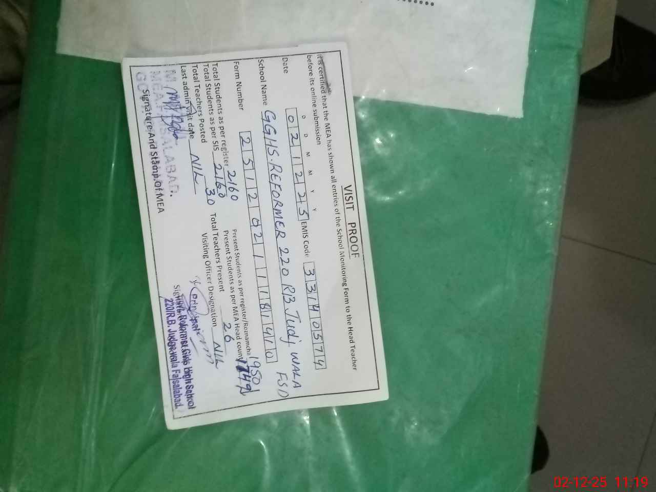 | Attendance Register | Head Teacher | MEA with School | Visit Proof |