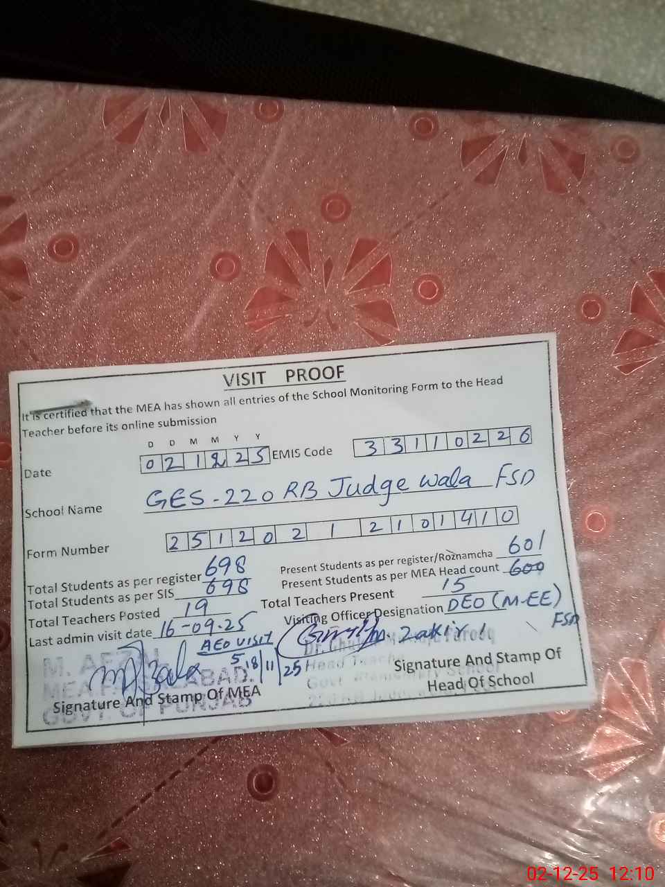 | Attendance Register | Head Teacher | MEA with School | Visit Proof |